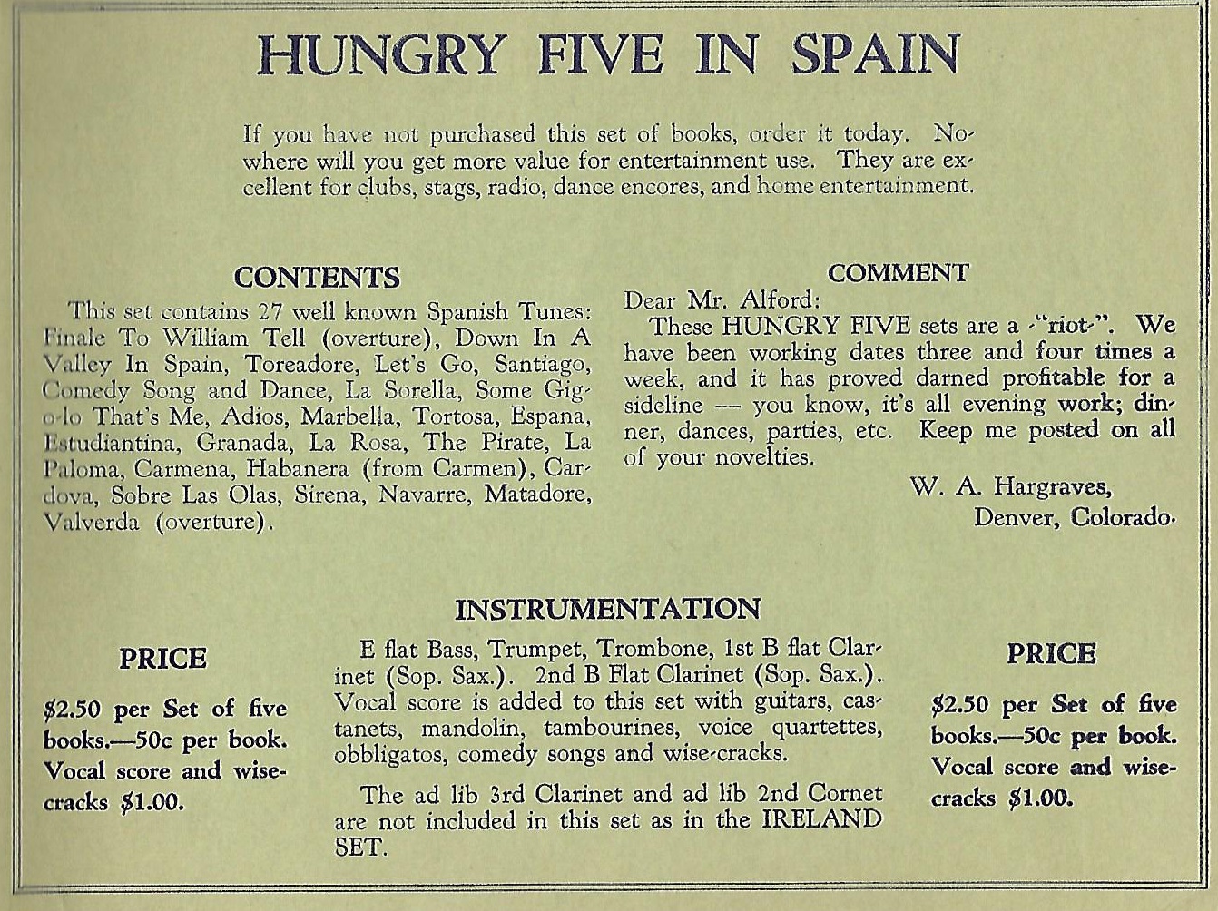 Harry L. Alford's Hungry Five in Spain was the followup publication following the popular Germany book. While the instrumentation is unchanged from the original, there is mention of a separate Vocal Score as a companion publication.