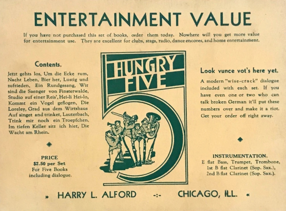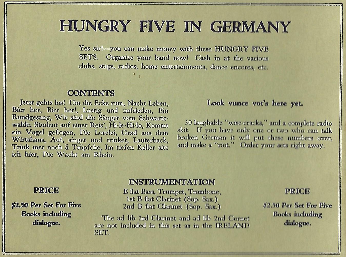 Also featured in these earliest Hungry Five books were a series of "Wisecracks," pre-written jokes and skits derived from Herr Louie's radio programs intended for use as stage banter.